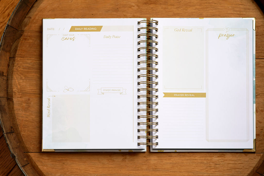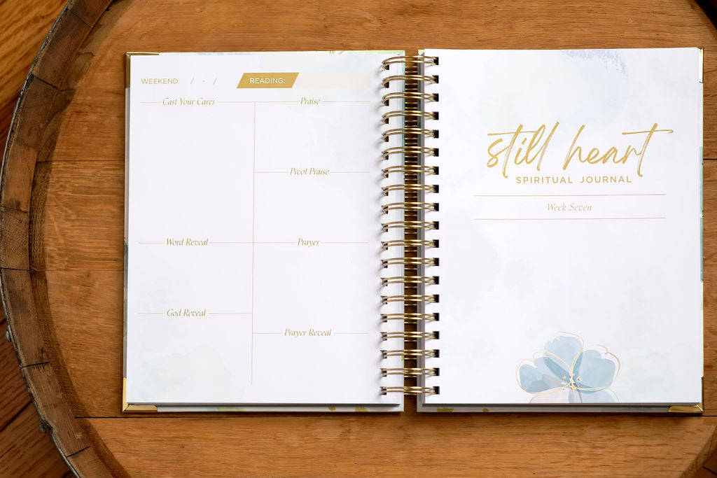 The Still Heart Spiritual journal is designed as a tool used to read, study and journal through the Bible cover to cover. Volume One is designed to experience God’s living and breathing Word with a chronological one-year reading plan for the first 26 weeks. The Still Heart Spiritual Journal was designed for the woman that loves beautifully crafted journaling products focusing on high quality 120gsm paper, hard cover designs, and brass metal corners not only for an elegant look but providing protection to last for many years. The journal was designed for the writer in mind, giving two oversized undated pages having the ability to start at any time during the year at the beginning of the week on a Monday. Each day, the journal offers space to record your praises, give your cares to God, reflect on the Scripture reading for the day, discover something new about our Heavenly Father and record prayers while remembering those answered. The matte gold metal wire binding was designed for both beauty and practicality offering the writer the ability to lay pages flat or fold pages around to the back offering more working space.